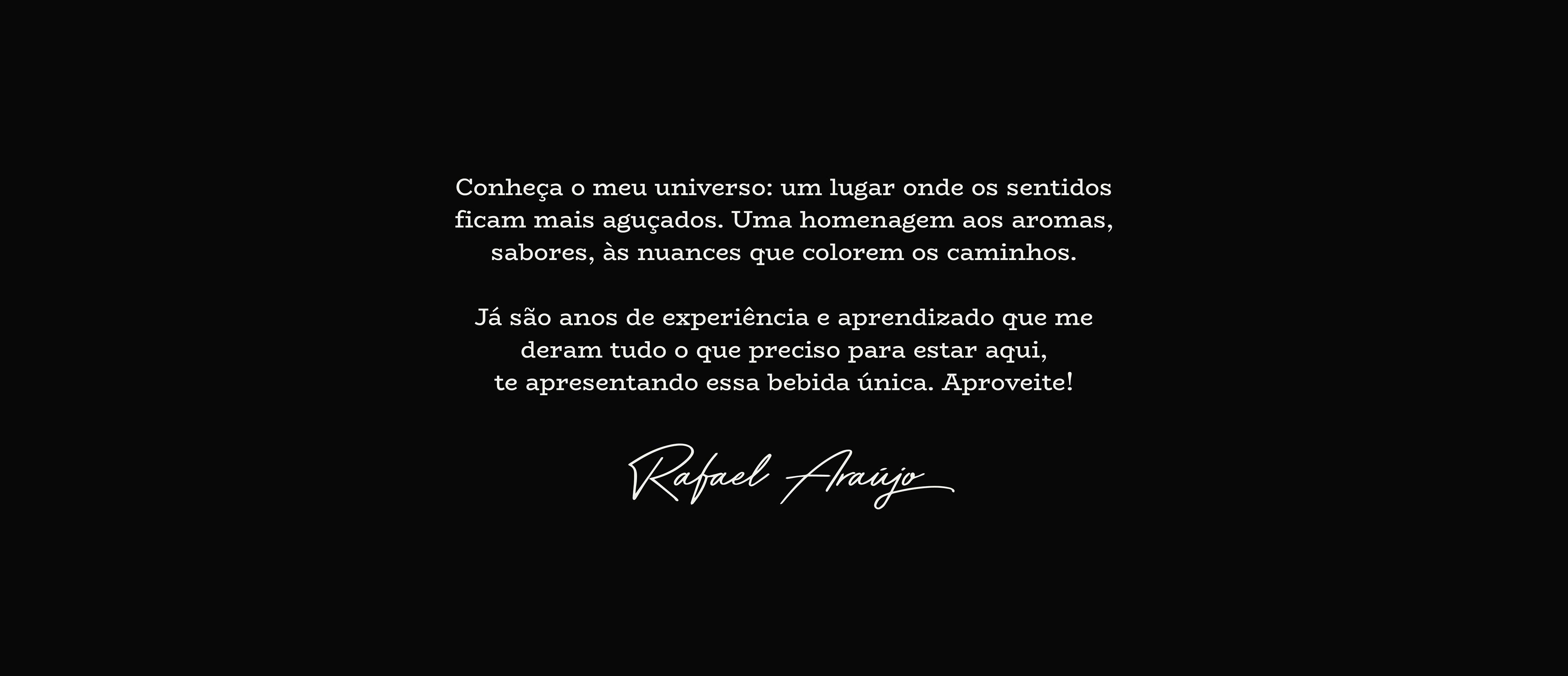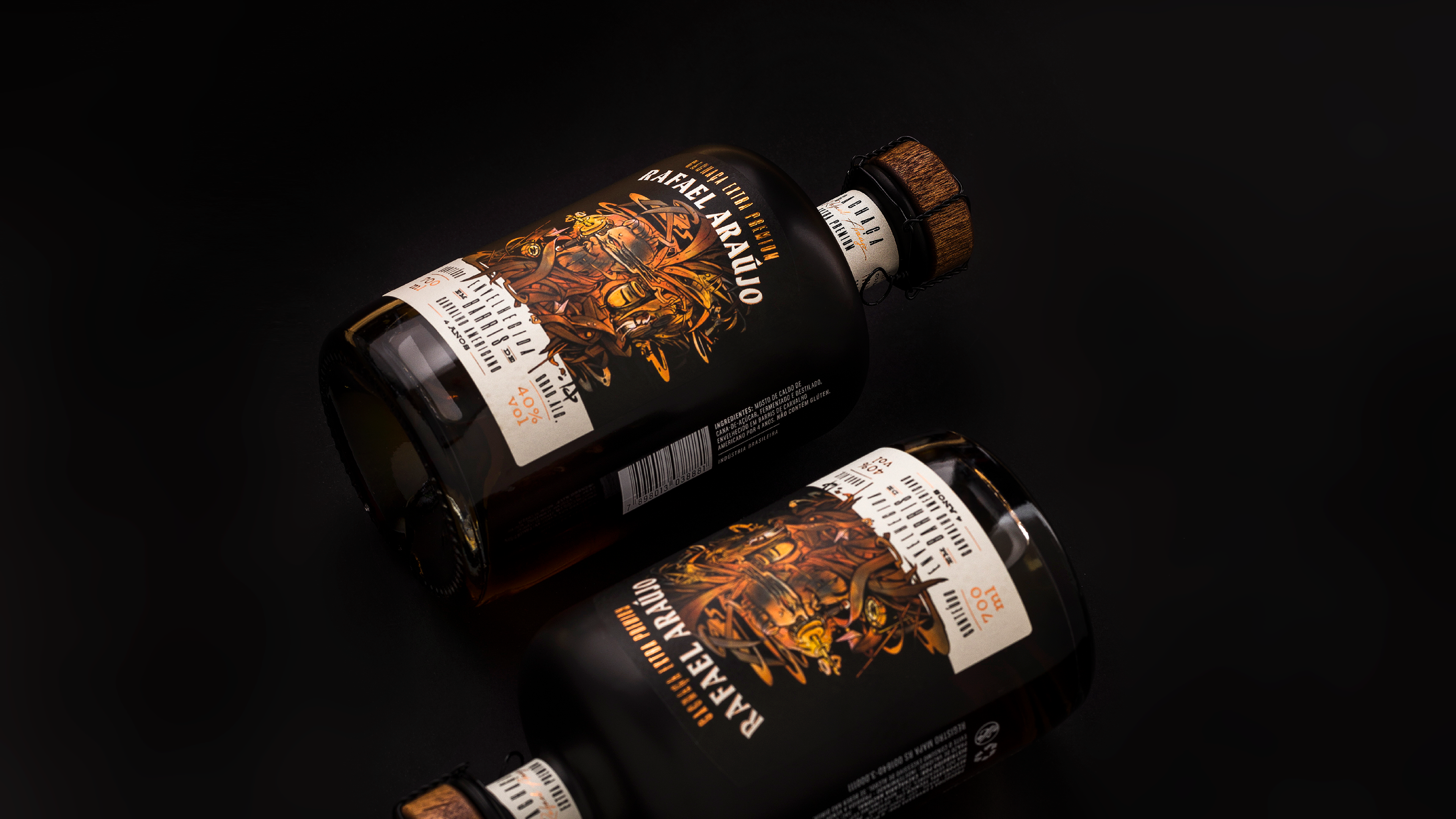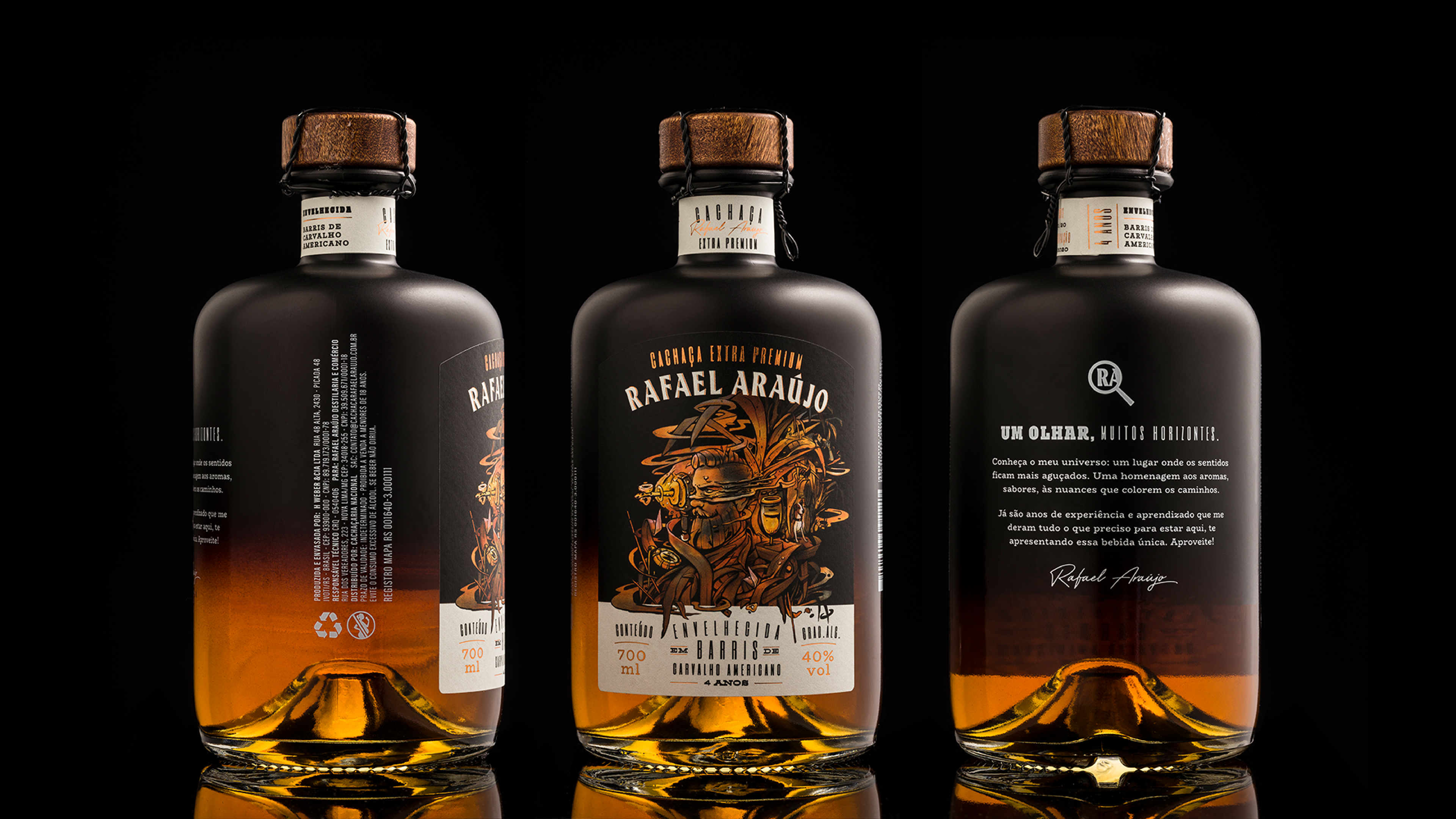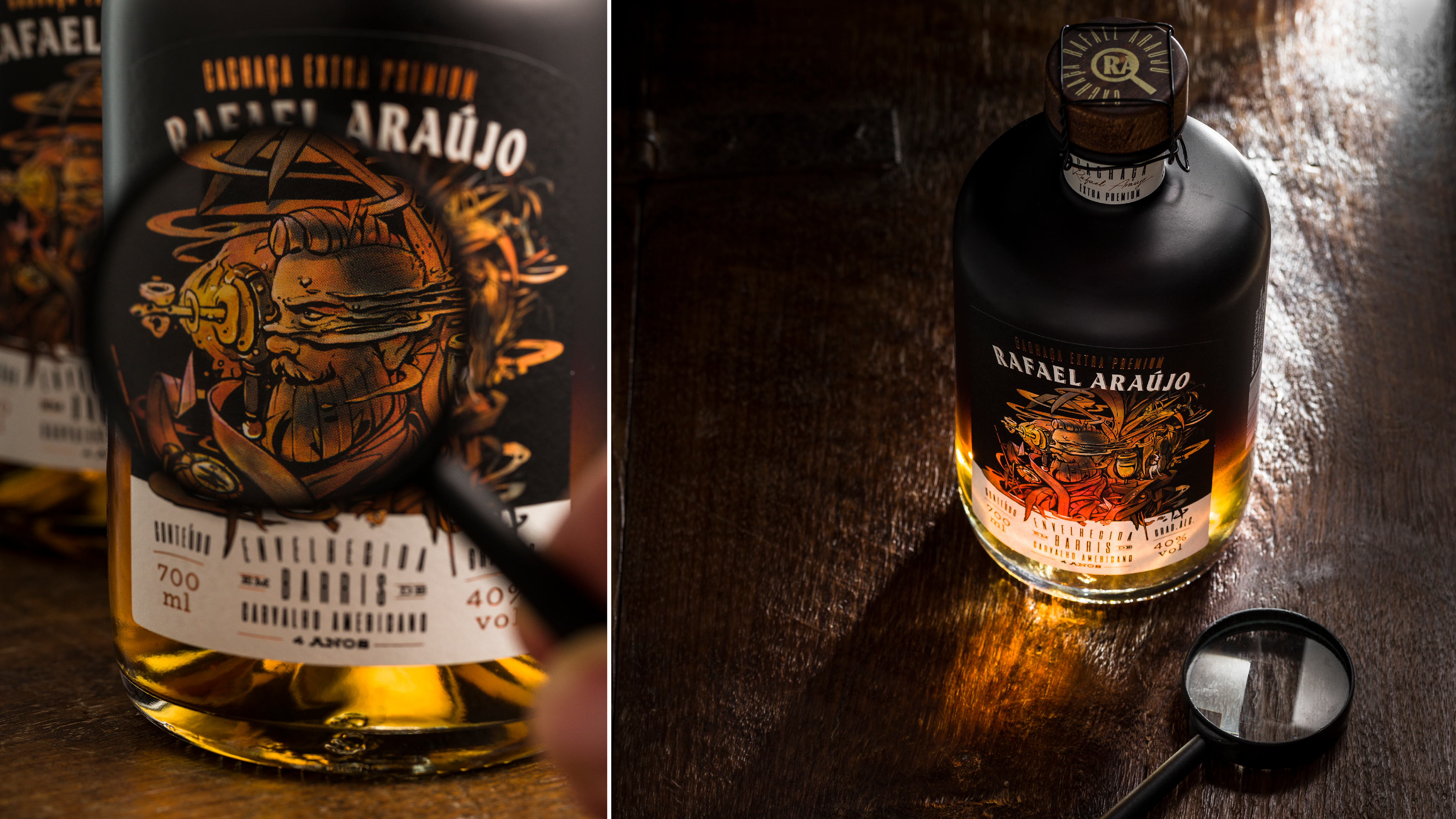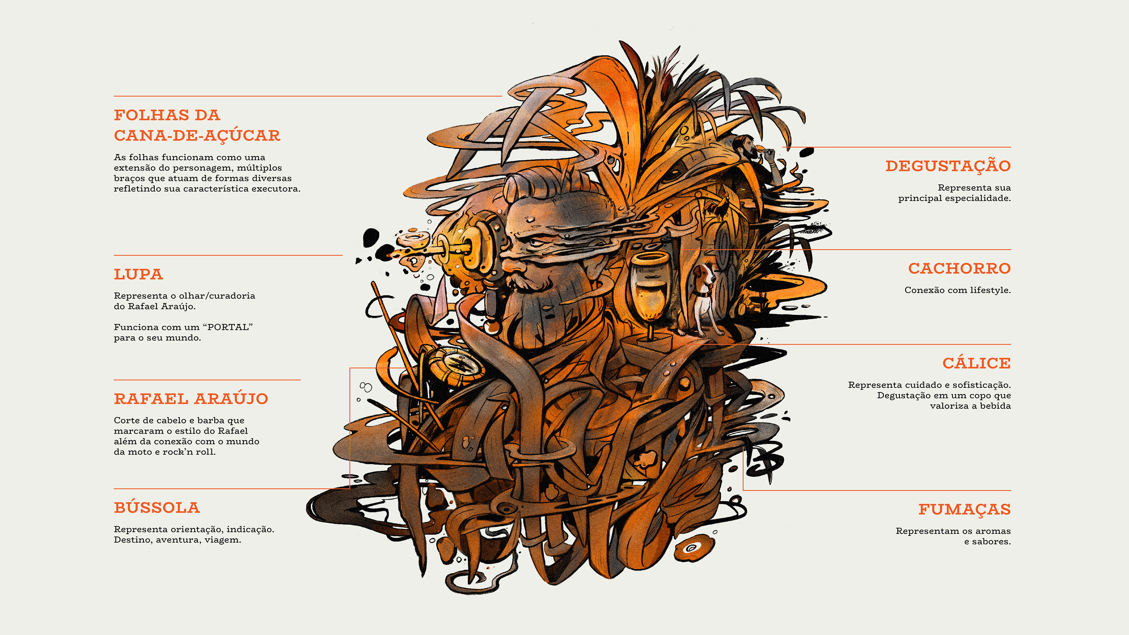 Um novo olhar para o setor das cachaças. Através de uma ilustração rica em detalhes e cores inspiradas nos tons da bebida foi representada uma amostra do universo do Rafael para o consumidor, voltado para um público jovem, aventureiro e fã de rock, onde a lupa representa sua curadoria e assinatura.