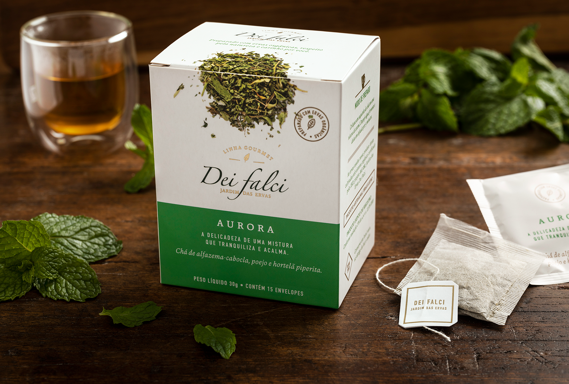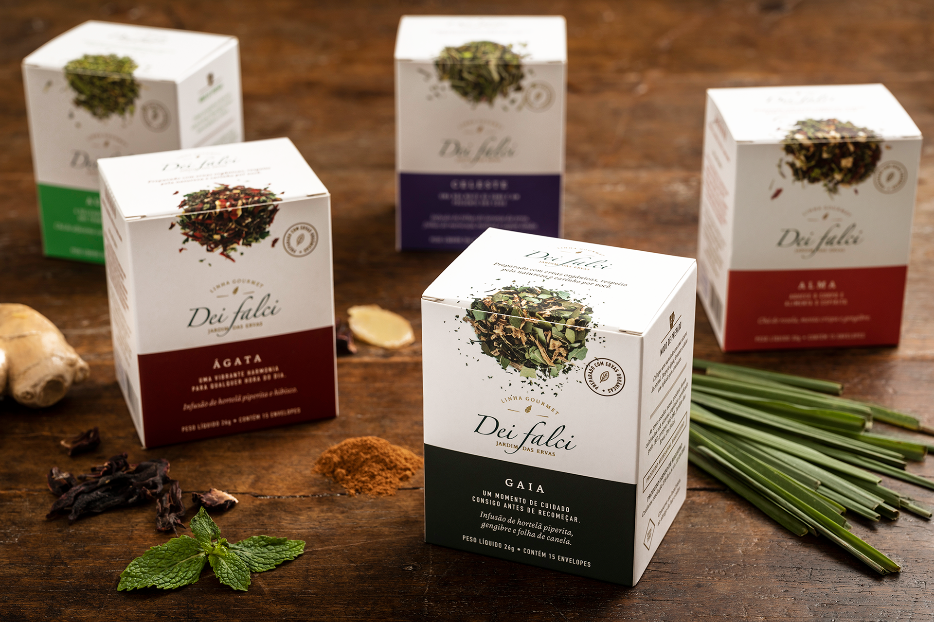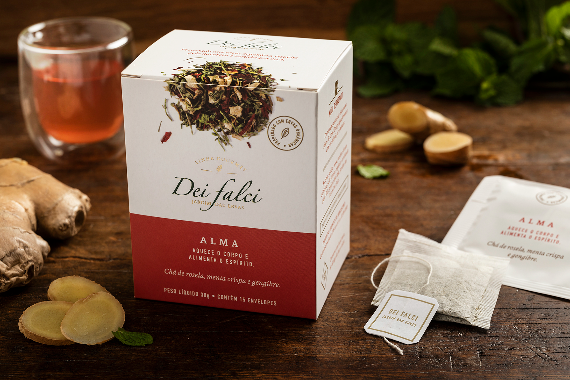 A linha de chás, inspirada em nomes femininos que trazem conforto e delicadeza, explora o branco e fotografias leves, cheias de frescor, além de grandes blocos de cor que ajudam a identificação do produto e compõe uma coleção rica e em constante crescimento. Para os temperos, tons escuros trazem elegância e sofisticação enquanto o contraste com o verde e a utilização da imagens fazem o link com o restante da linha de produtos.