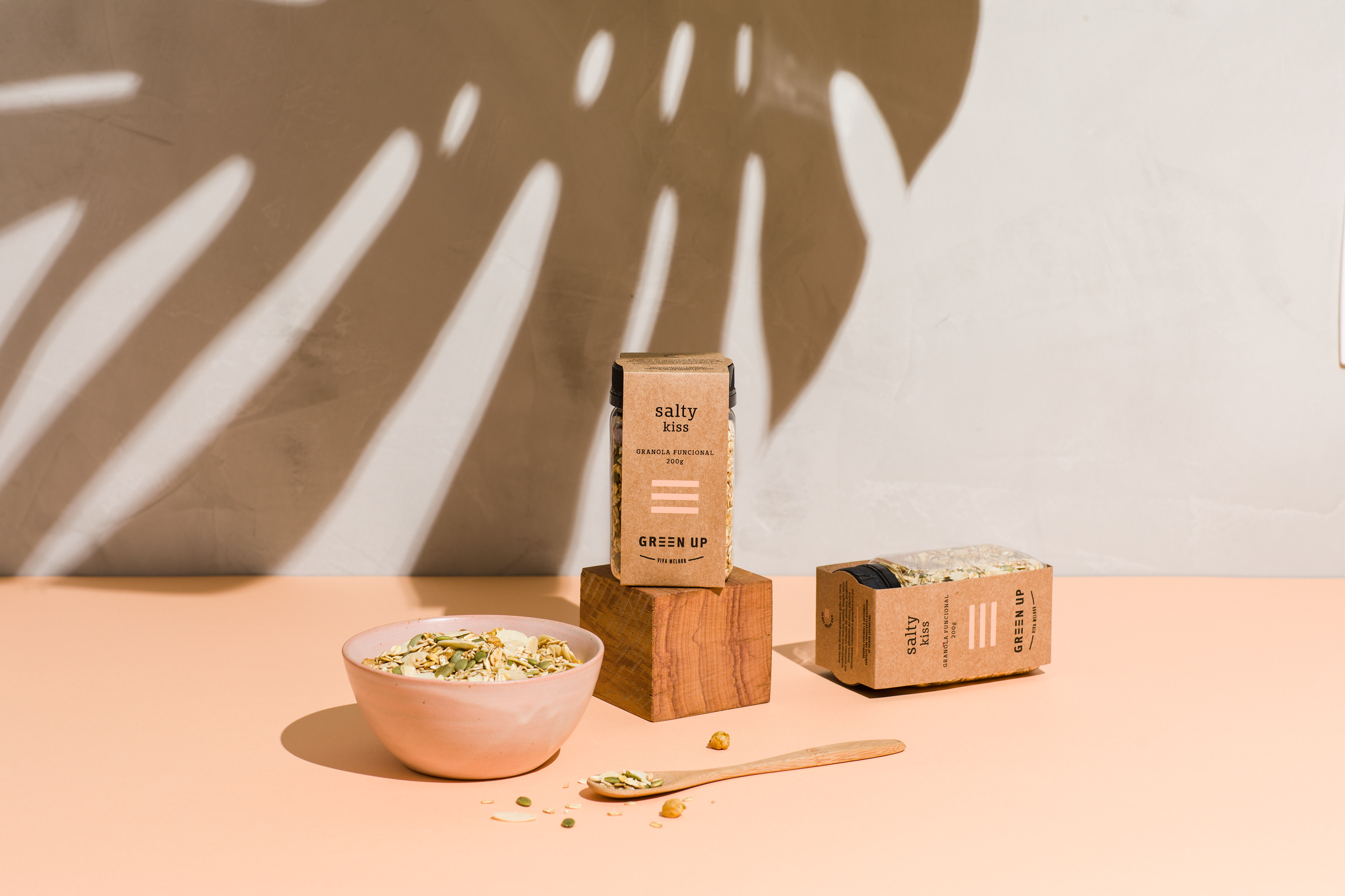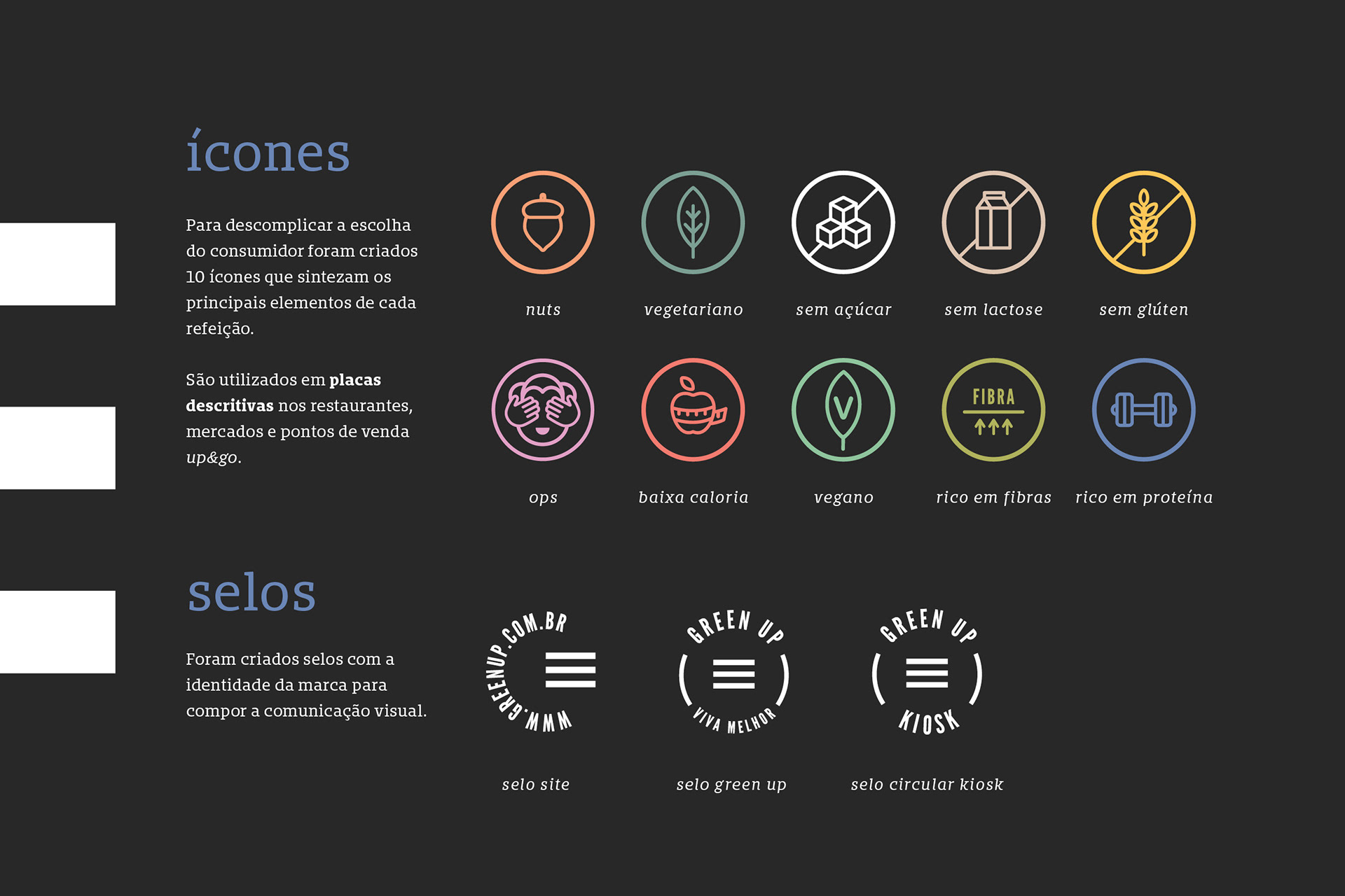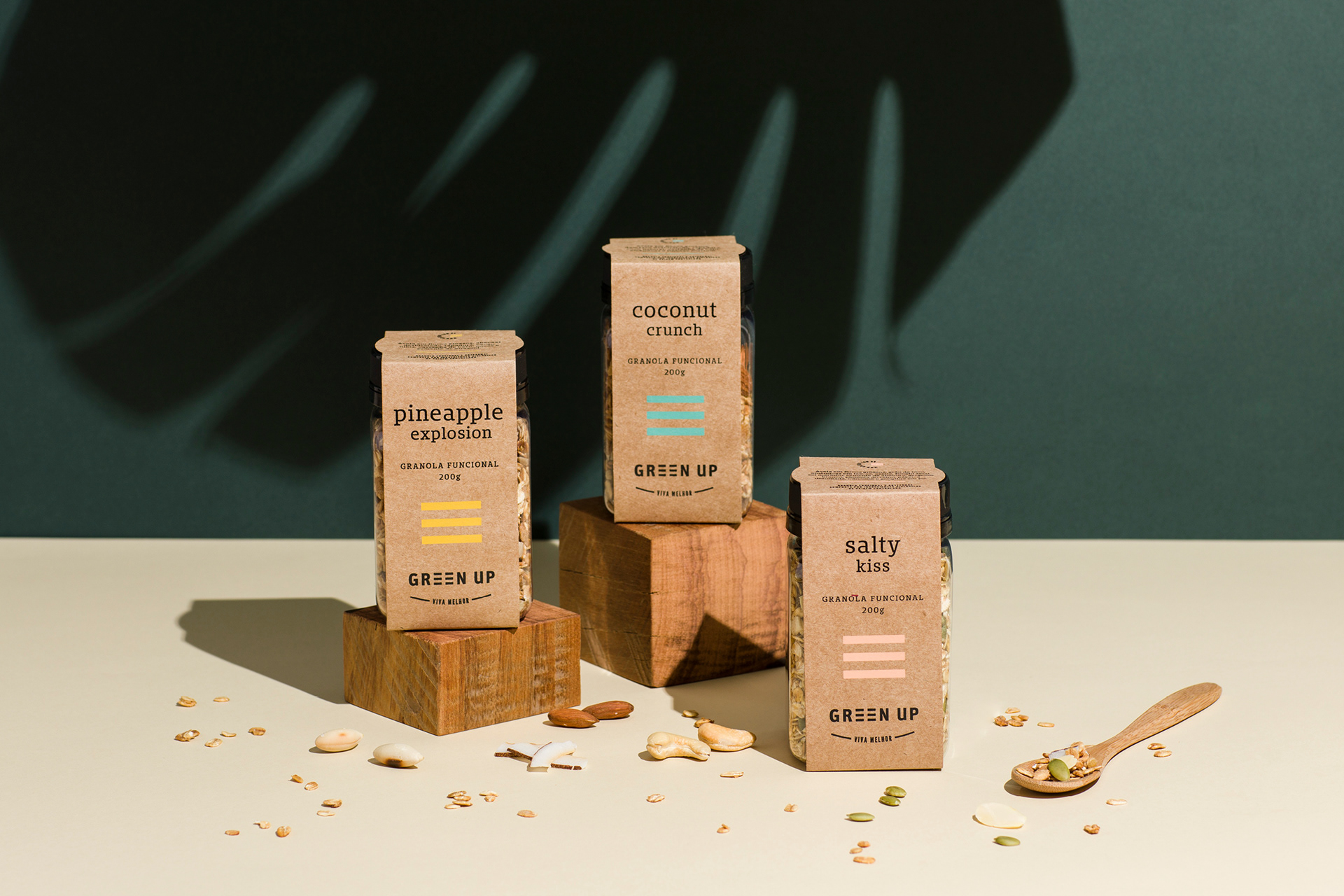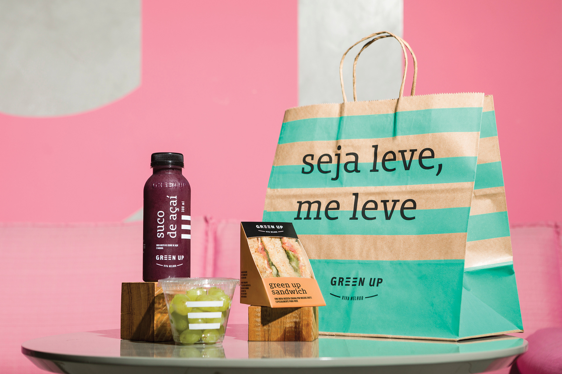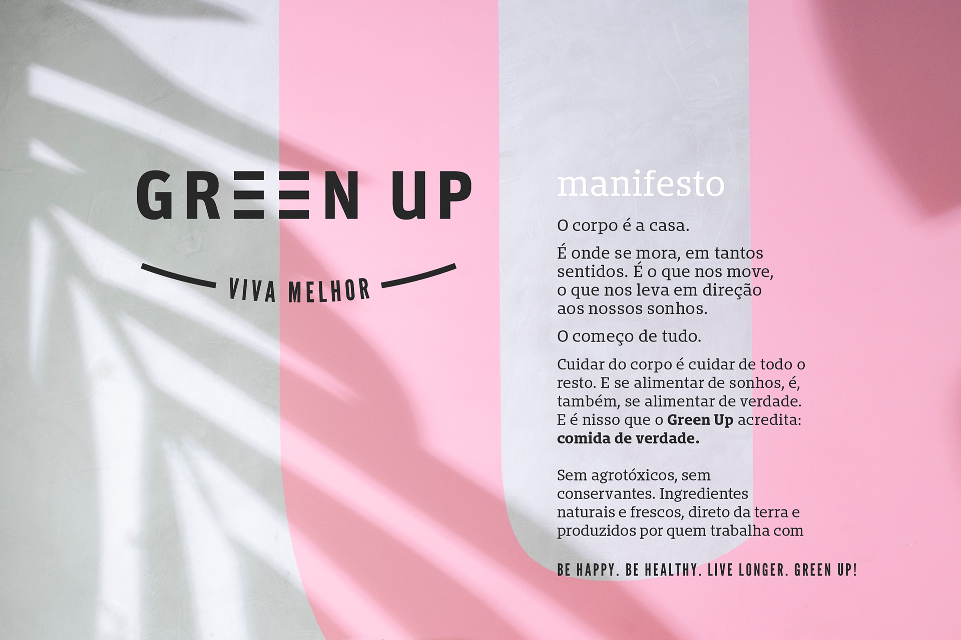 Foi criado, então, um projeto de branding, no qual se traçou a estratégia de marca: naming, manifesto, identidade visual, repertório gráfico, embalagens, site e espaço físico, apresentando o Green Up em todo o seu potencial.