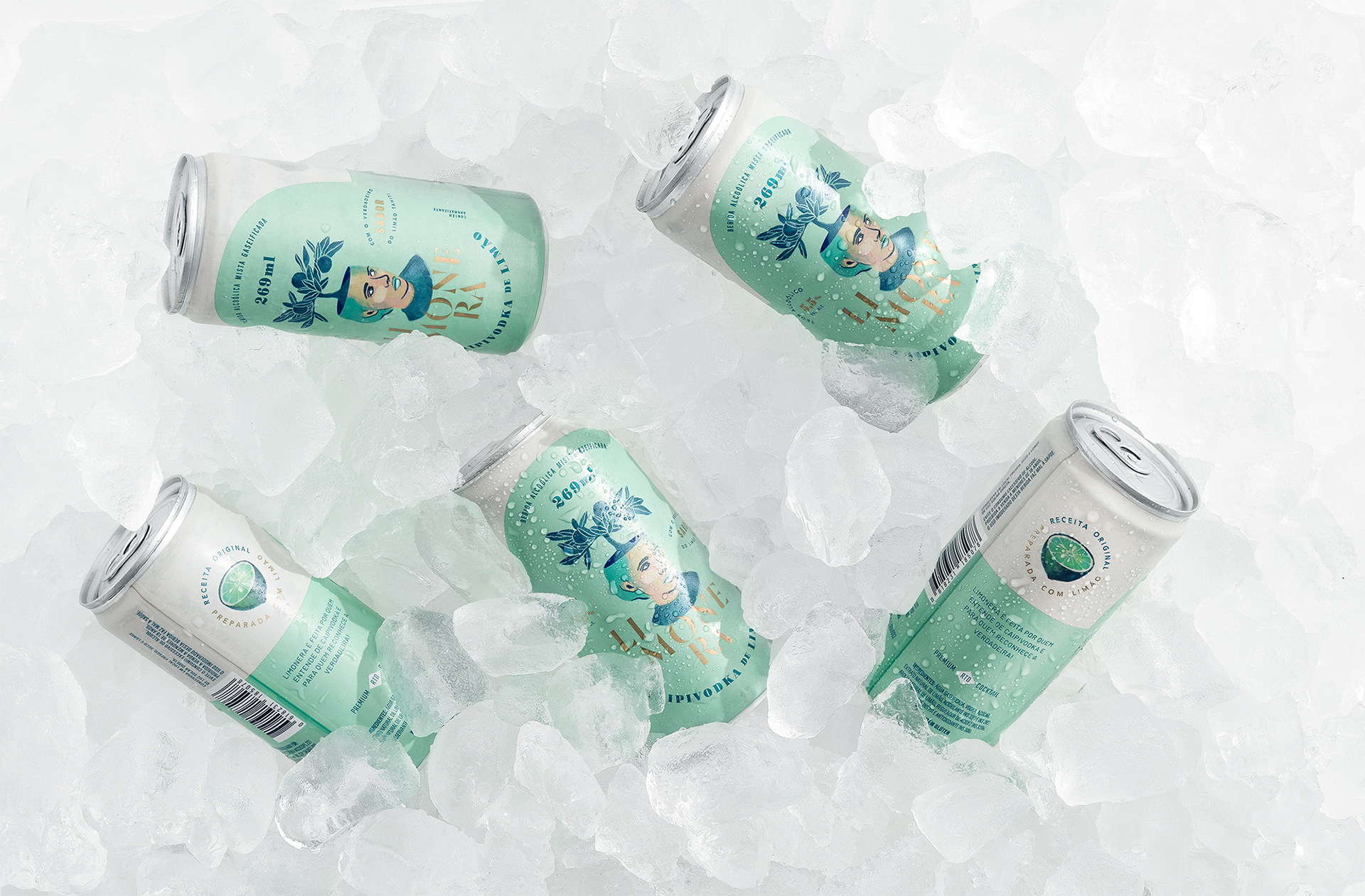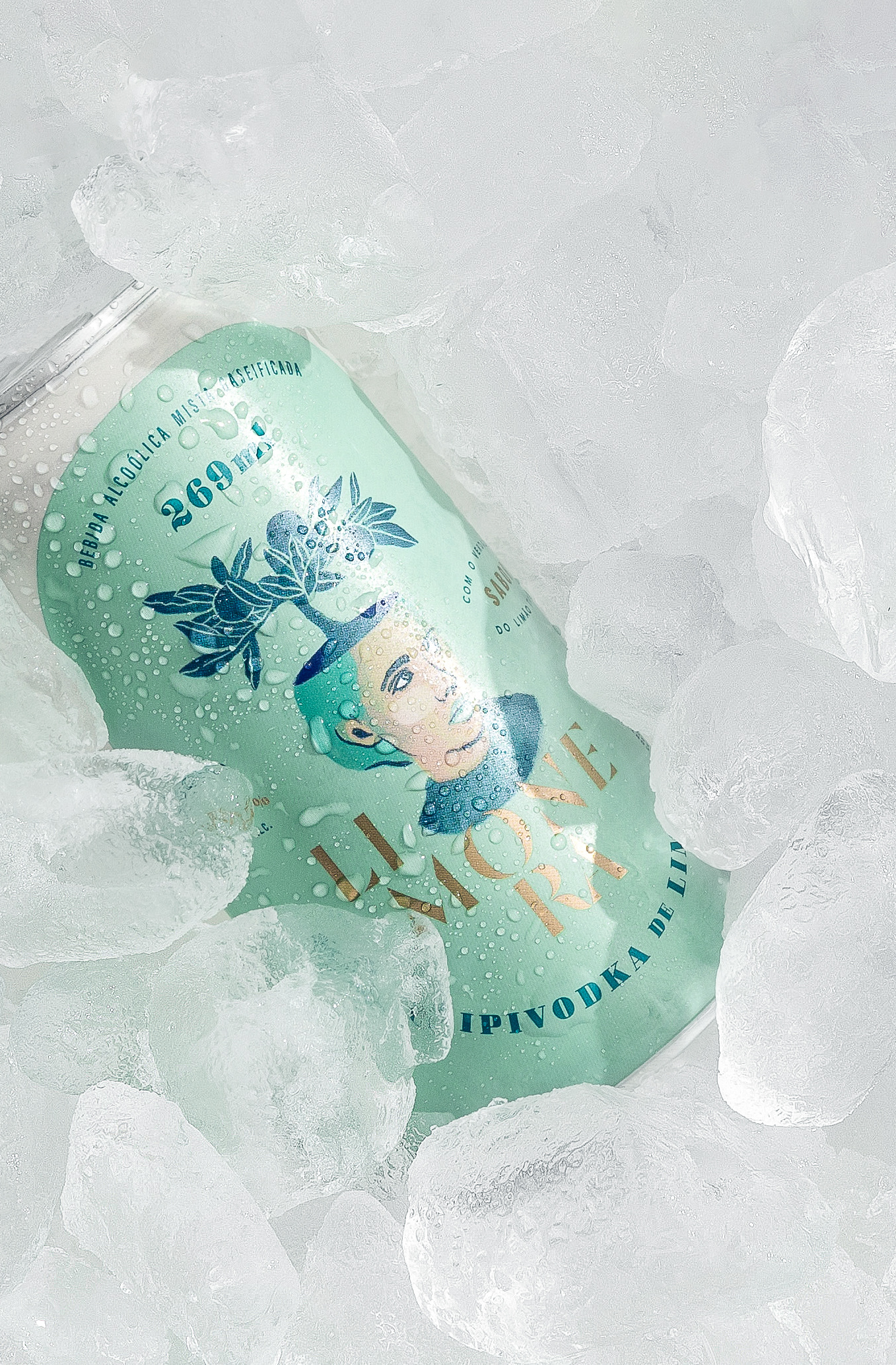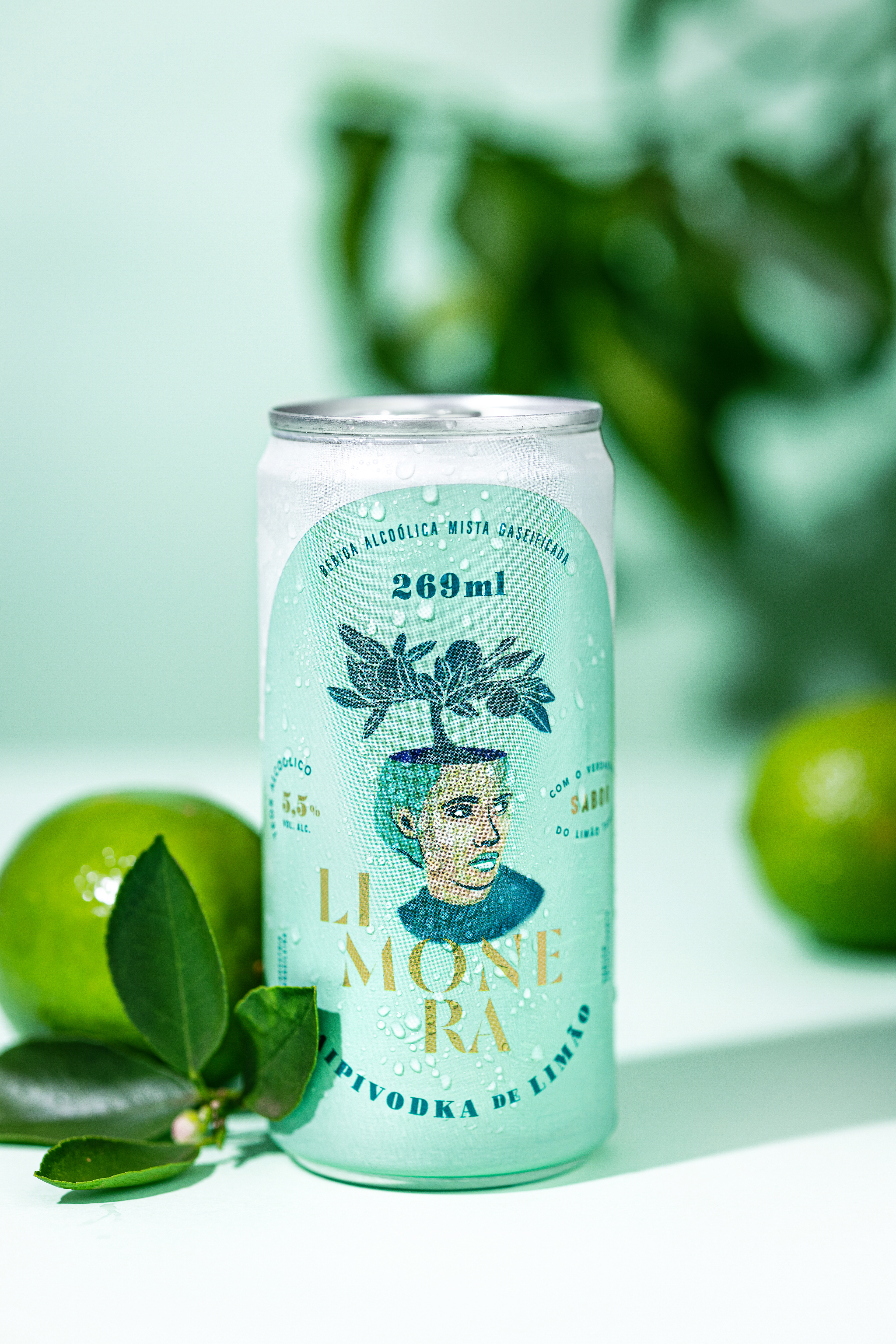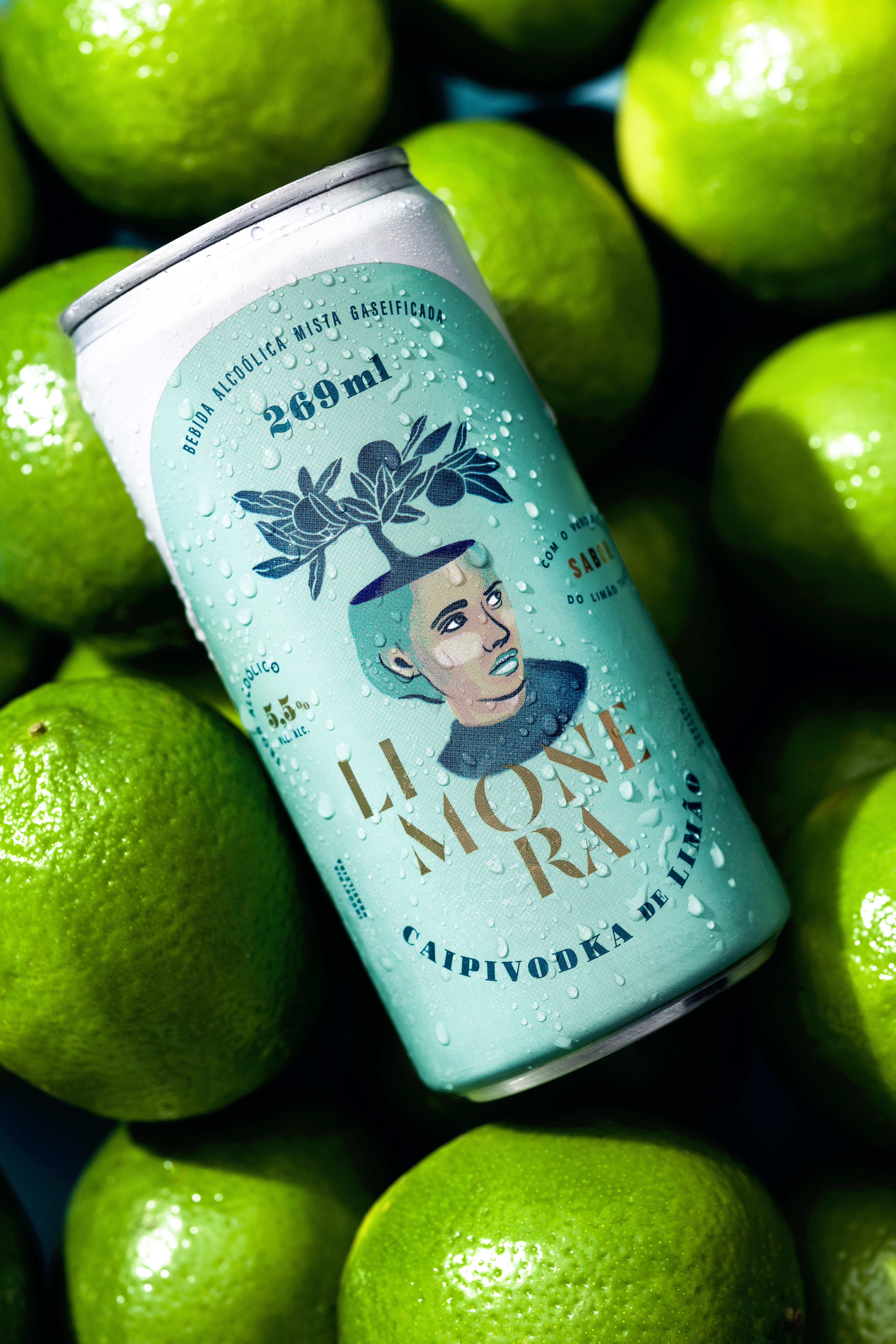 Limonera é uma caipivodka em lata, e seu projeto gráfico destaca o sabor do limão - o ingrediente principal dessa receita. A ilustração coloca ênfase na qualidade natural da bebida, mostrando o frescor do ingrediente ainda no limoeiro.